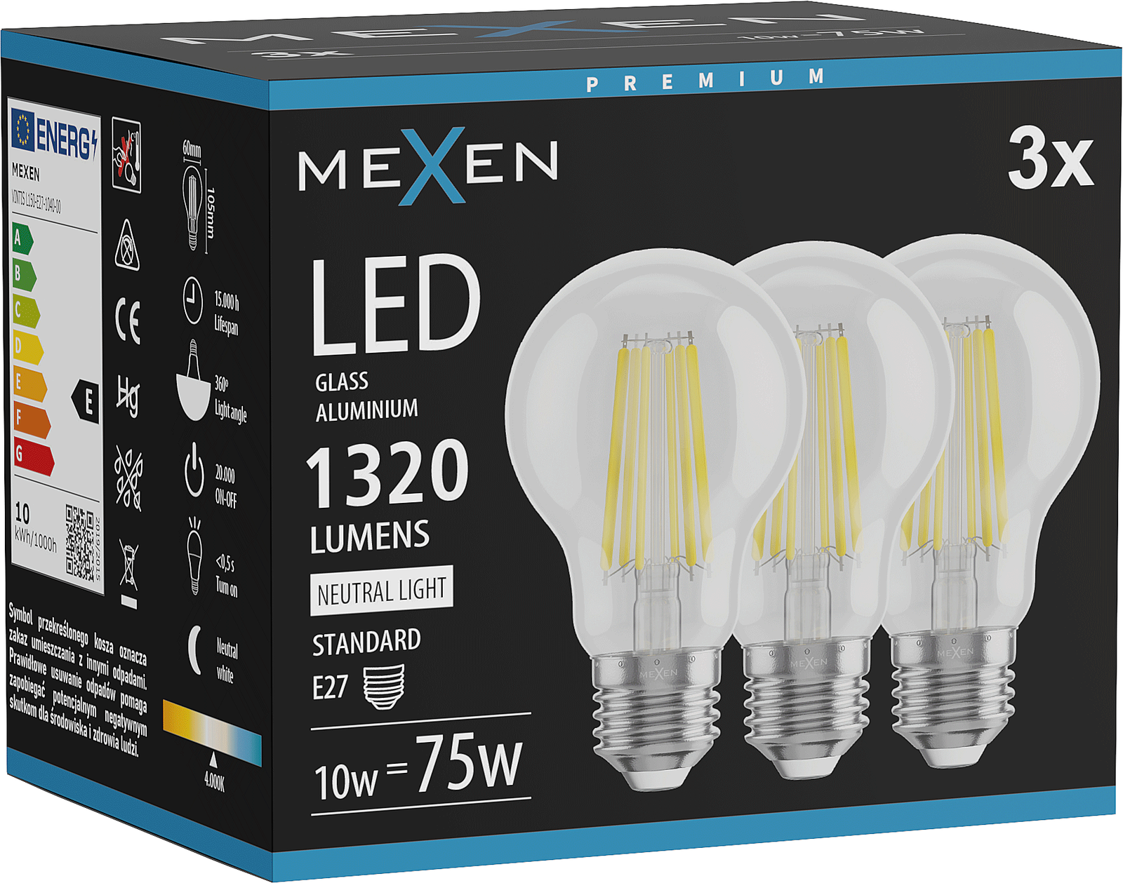 Mexen Vintis 3x Λάμπα νήματος LED E27, A60, 10W, Ουδέτερο - 4000K, 1320 lm, διάφανο