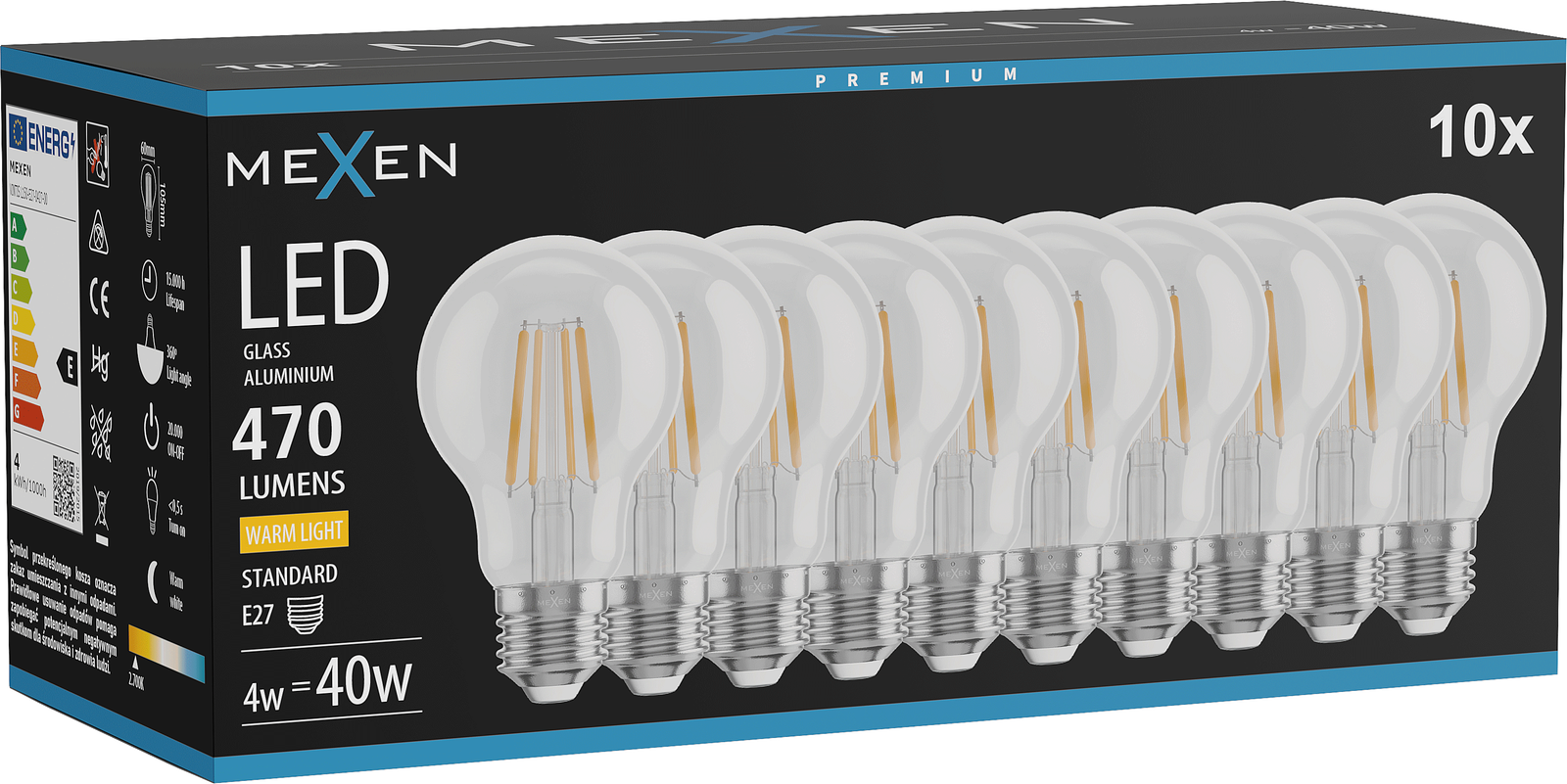 Mexen Vintis 10x Λαμπτήρας νημάτων LED E27, A60, 4W, Θερμό - 2700K, 470 lm, διαφανές