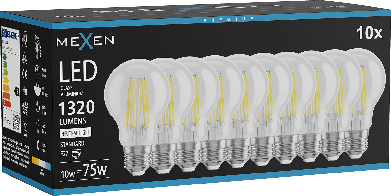 Mexen Vintis 10x Λαμπτήρας LED νήματος E27, A60, 10W, Ουδέτερο - 4000K, 1320 lm, διάφανο