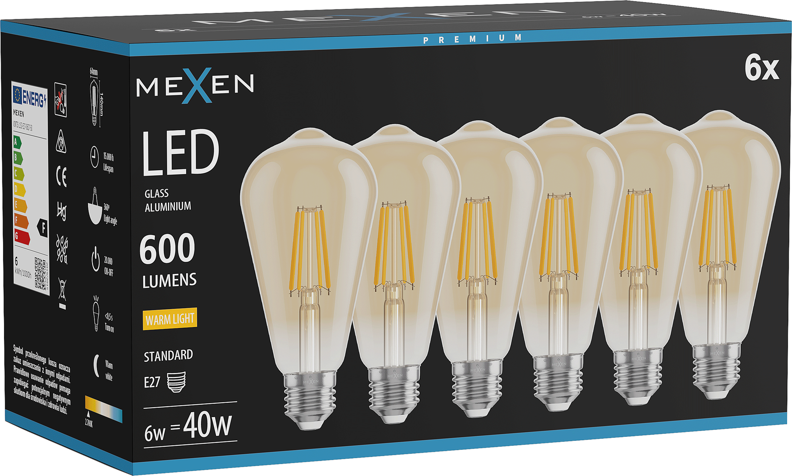 Mexen Vintis 6x Λαμπτήρας νήματος LED E27, ST64, 6W, Θερμό - 2700K, 600 lm, κεχριμπαρένιο