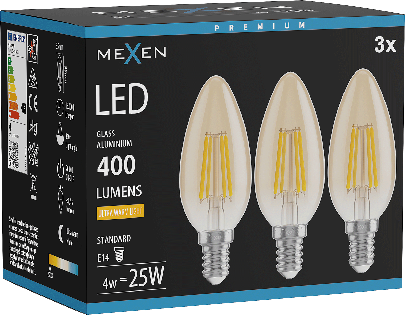 Mexen Vintis 3x Λαμπτήρας filament LED E14, C35, 4W, Θερμό - 2200K, 400 lm, κεχριμπαρένιο