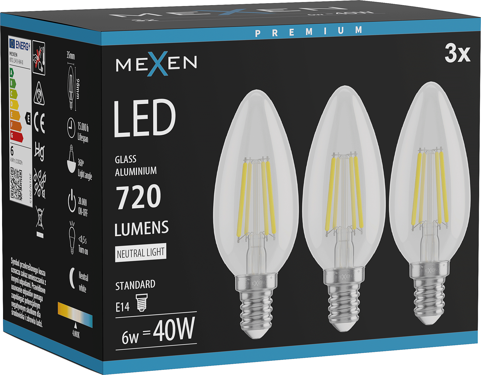 Mexen Vintis 3x Λάμπα νήματος LED E14, C35, 6W, Ουδέτερη - 4000K, 720 lm, διάφανη