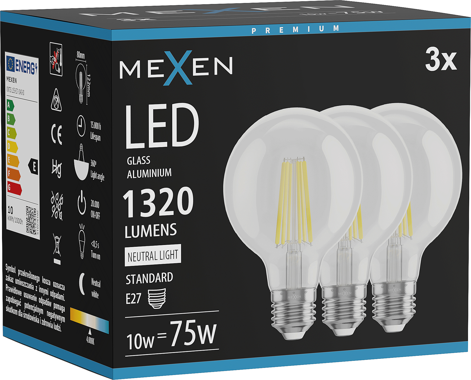 Mexen Vintis 3x Λαμπτήρας νήματος LED E27, G80, 10W, Ουδέτερο - 4000K, 1320 lm, καθαρό