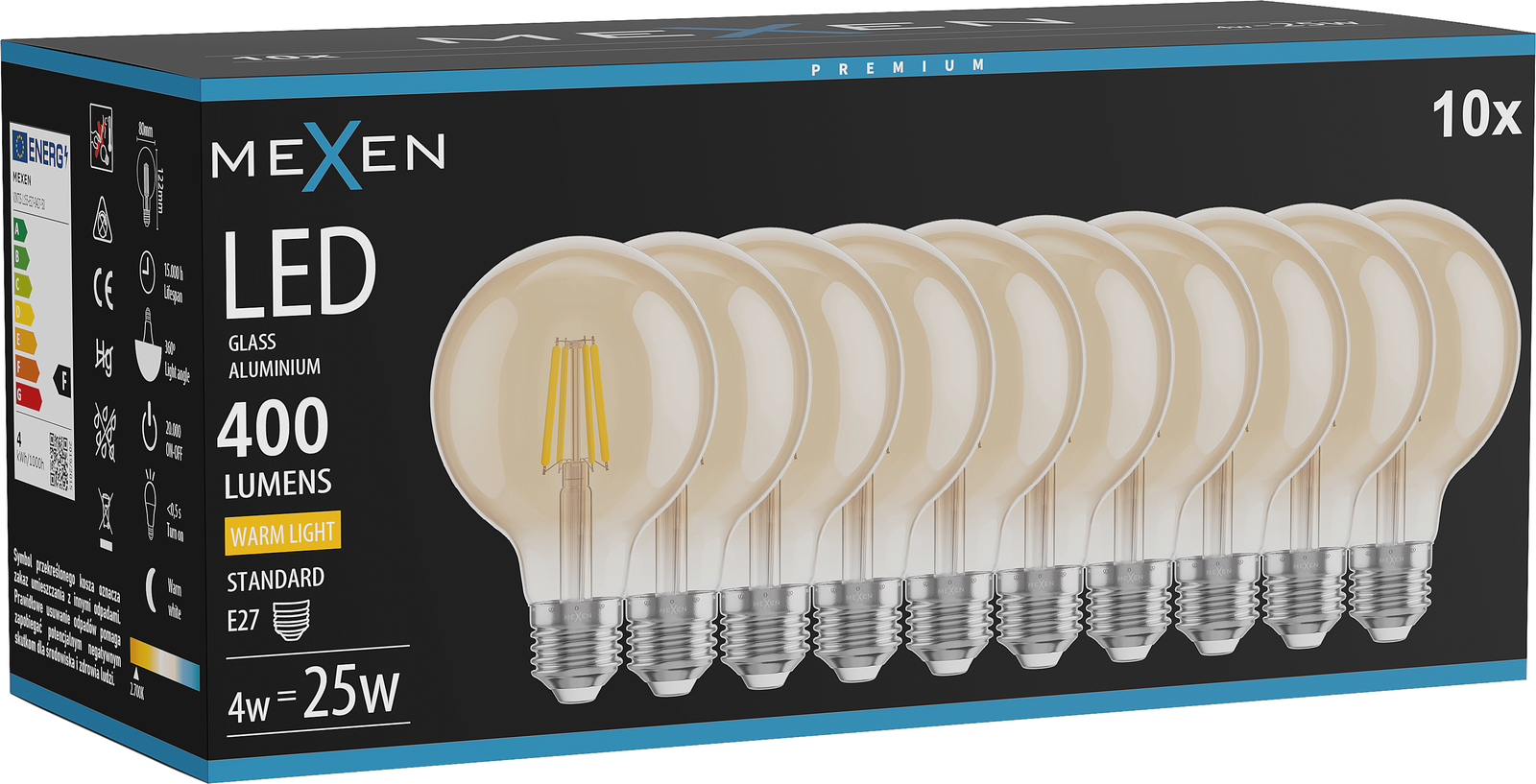 Mexen Vintis 10x λαμπτήρας LED filament E27, G80, 4W, Θερμό - 2700K, 400 lm, κεχριμπαρένιο