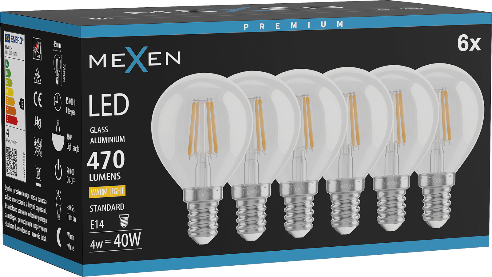 Mexen Vintis 6x Λαμπτήρας LED φιλαμέντο E14, G45, 4W, Θερμό - 2700K, 470 lm, διαυγής