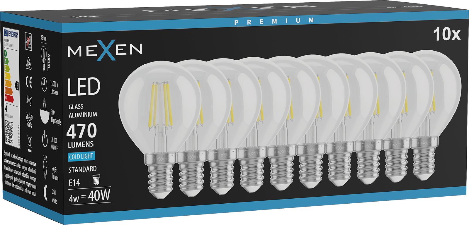 Mexen Vintis 10x LED λαμπτήρας με νήμα E14, G45, 4W, Κρύο - 6500K, 470 lm, διαφανές
