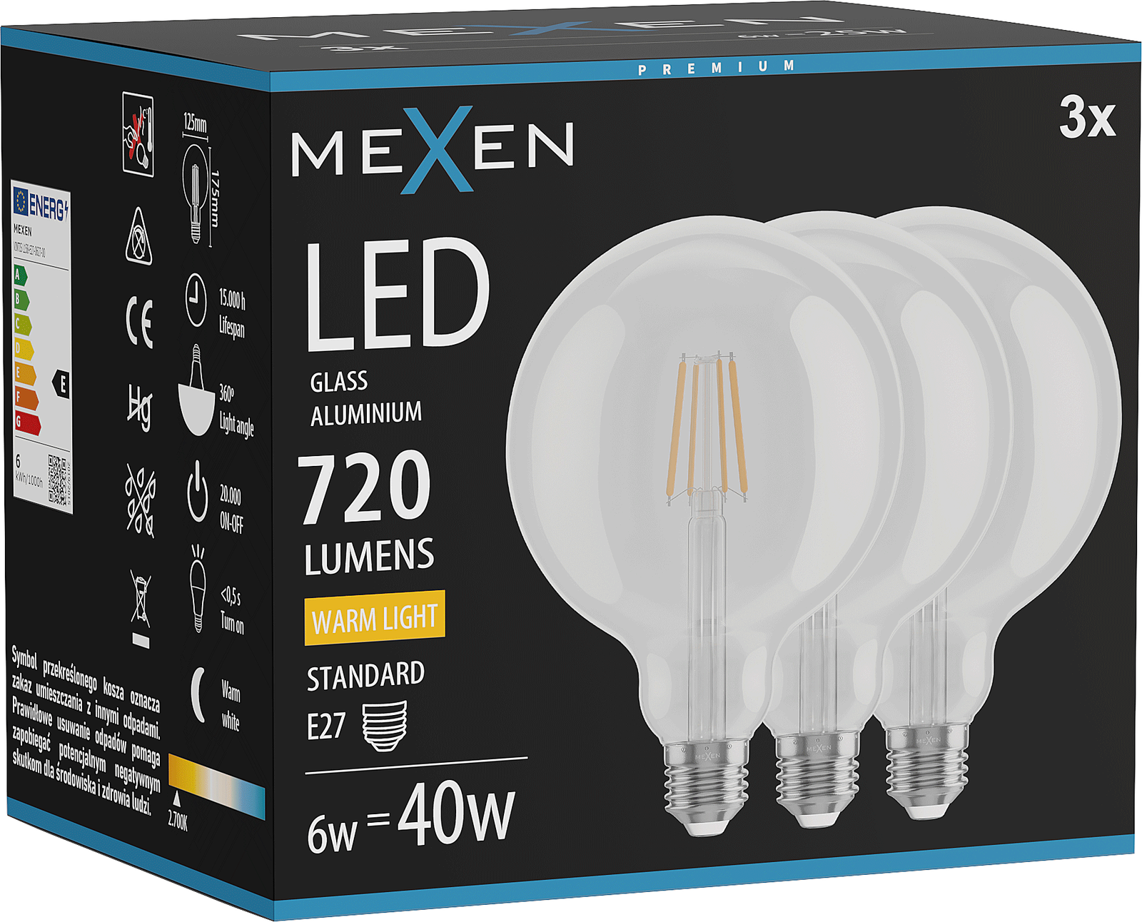 Mexen Vintis 3x Λαμπτήρας LED νήματος E27, G125, 6W, Θερμό - 2700K, 720 lm, διαφανές