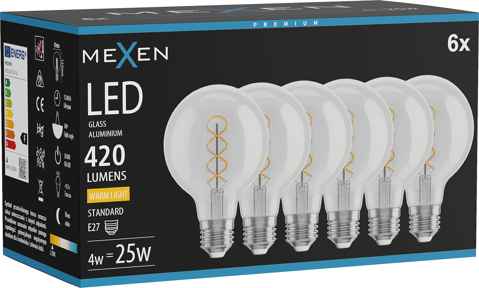 Mexen Vintis 6x Λάμπα νήματος σπειροειδής LED E27, G80, 4W, Θερμό - 2700K, 420 lm, καθαρό