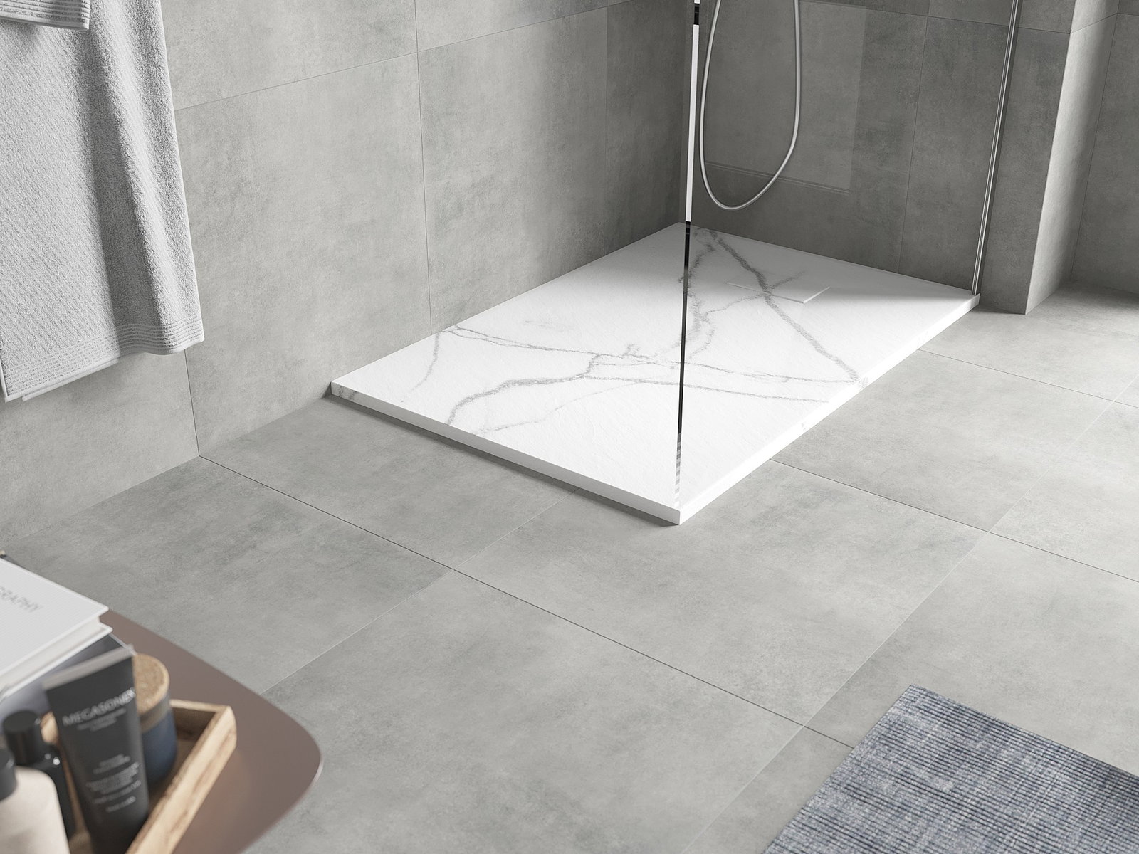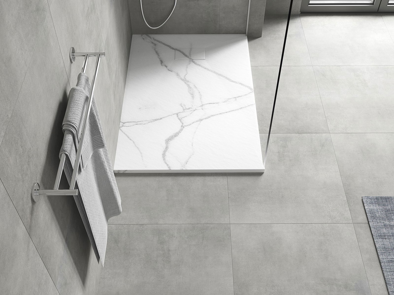 Η επιφάνεια της ντουζιέρας με τη δομή της θυμίζει πέτρα. Αποτελεί έναν εξαιρετικό συνδυασμό φυσικής εμφάνισης με σύγχρονη εσωτερική διαρρύθμιση. Προσθέτει χαρακτήρα, υπογραμμίζει την αισθητική και την κομψότητα της διακόσμησης του μπάνιου και εντυπωσιάζει με τη μορφή της.
