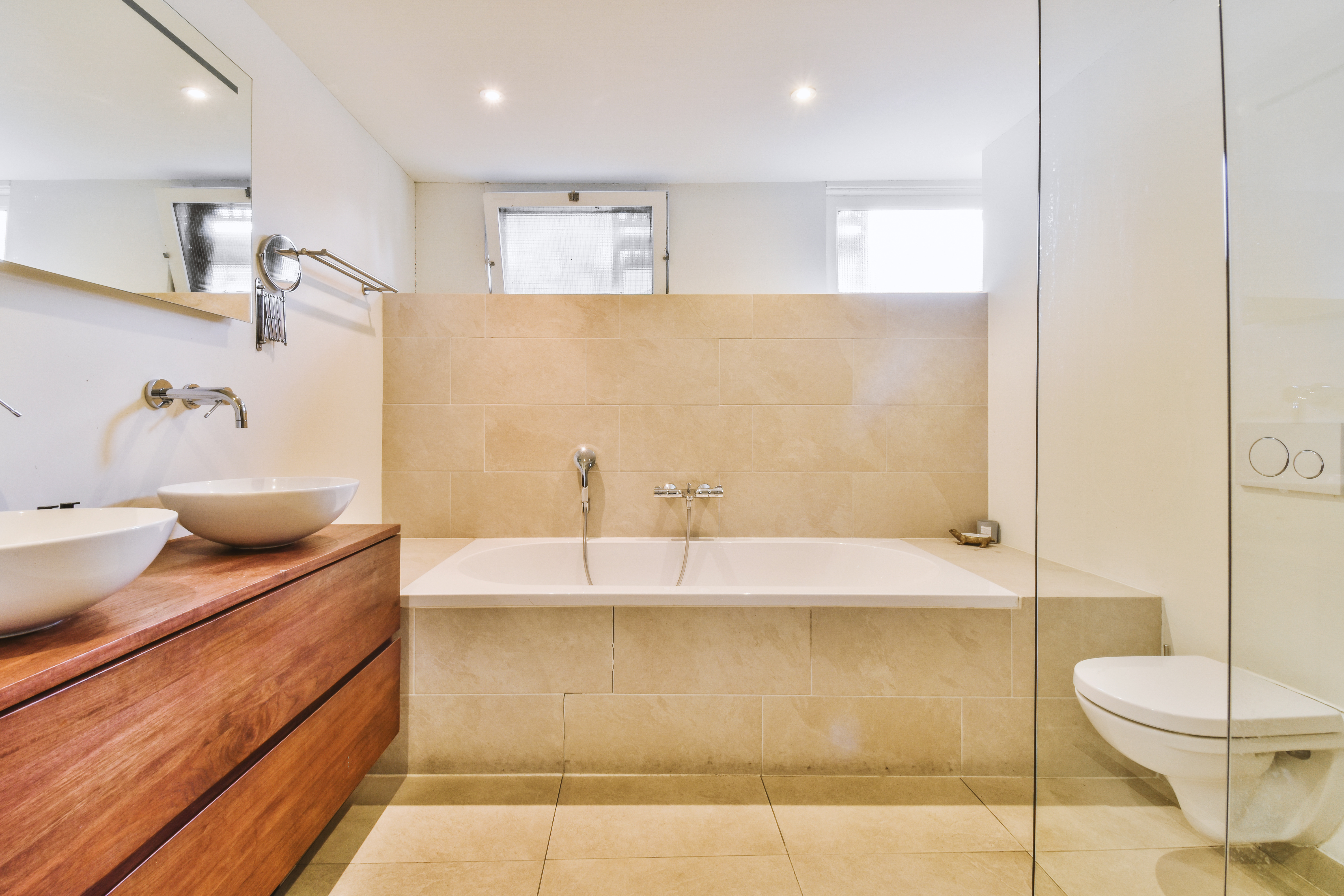 Η επιλογή των κατάλληλων υλικών, που είναι ανθεκτικά στην υγρασία και εύκολα στη συντήρηση, αποτελεί τη βάση. Τα πιο συχνά επιλεγμένα υλικά είναι τα υδρόφοβα πάνελ από υγιεινούς ακρυλικούς, που είναι εύκολα στην επεξεργασία και λειτουργούν άψογα σε συνθήκες αυξημένης υγρασίας. Πρέπει επίσης να προσέχετε στην ακρίβεια της στεγανοποίησης, ειδικά στα σημεία επαφής της μπανιέρας με το δάπεδο και τους τοίχους, για την αποφυγή διαρροών και δομικών ζημιών.