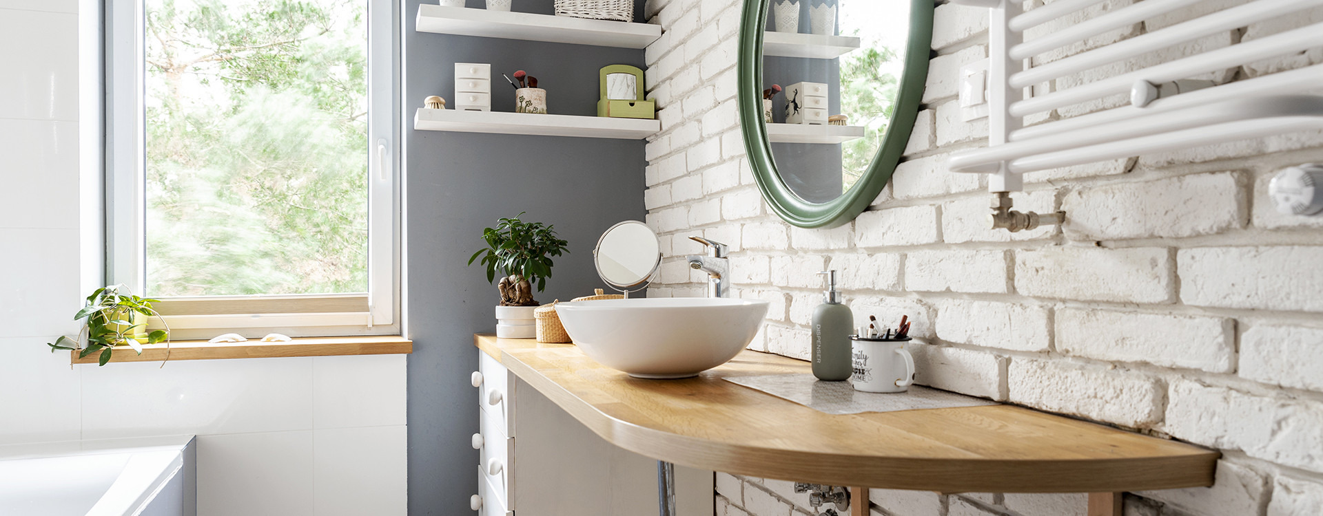 Μια άλλη μορφή τονισμού του σκανδιναβικού μπάνιου μας είναι το τούβλο – ακατέργαστο ή λευχωμένο. Αυτό το στοιχείο μπορεί επίσης να επιτευχθεί από απομίμησεις που δίνουν τα κεραμικά πλακάκια κατασκευασμένα με αυτή τη μορφή.