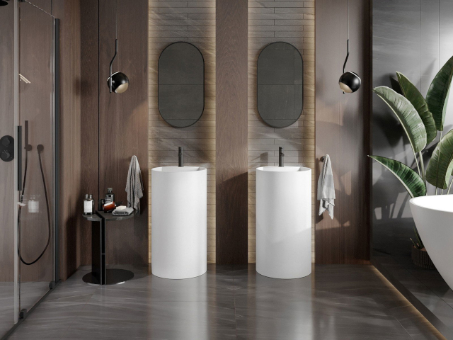 Η ενιαία επιφάνεια της πρόσοψης οργανώνει τη σύνθεση του τοίχου, κατευθύνει το βλέμμα προς τα πάνω και δεν προκαλεί αίσθημα συμπίεσης. Αυτό είναι που διακρίνει τη στήλη και της δίνει προβάδισμα έναντι των παραδοσιακών επίπλων. Η κρεμαστή στήλη μπάνιου αξιοποιεί το γεωμετρικό δυναμικό του μπάνιου, ενώ παράλληλα επιτρέπει την οπτική ελάφρυνση του χώρου, γεγονός που αποτελεί αδιαμφισβήτητο πλεονέκτημα αυτής της λύσης. Η στήλη μπάνιου συνδέει επίσης τις ζώνες χρήσης σε μια ενοποιημένη ολότητα, που μοιάζει να είναι φτιαγμένη κατά μέτρο. Φυσικά, υπό την προϋπόθεση ότι θα επιλέξετε το ντουλάπι νιπτήρα από την ίδια συλλογή.